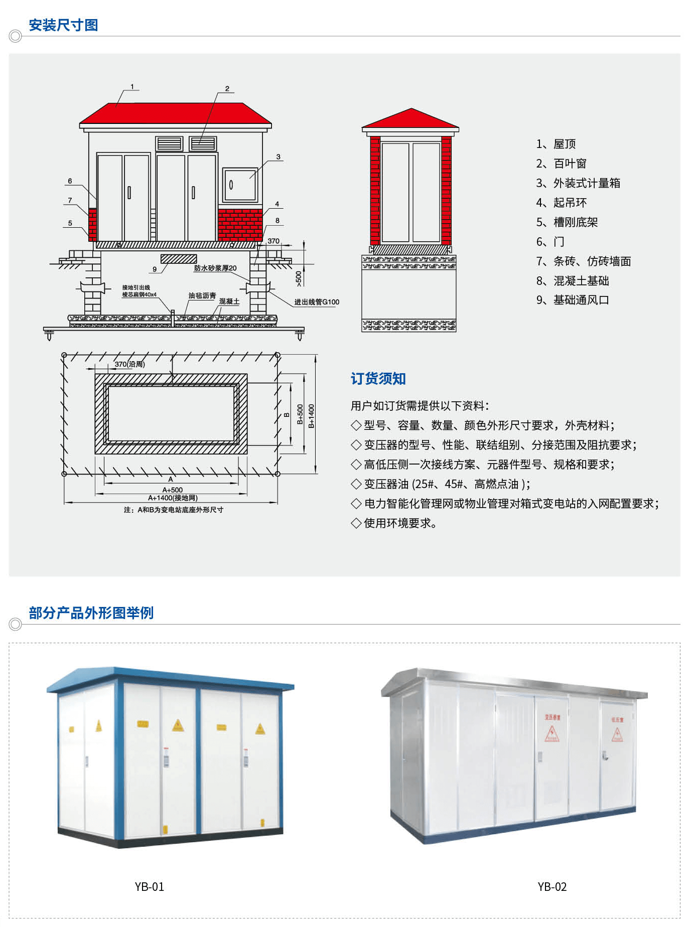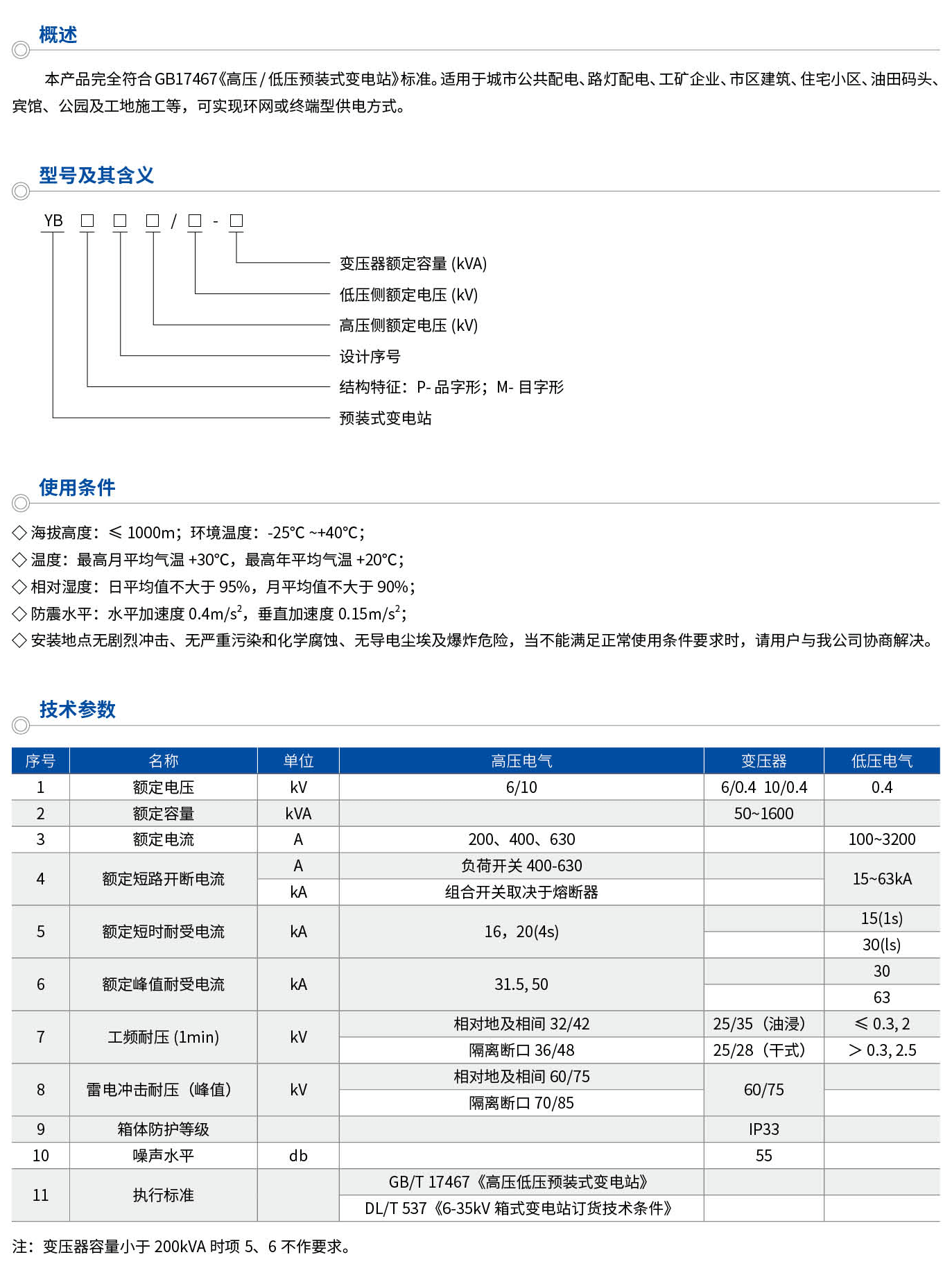 本產(chǎn)品完全符合GB17467《高壓/低壓預裝式變電站》標準。適用于城市公共配電、路燈配電、工礦企業(yè)、市區(qū)建筑、住宅小區(qū)、油田碼頭、賓館、公園及工地施工等,可實現(xiàn)環(huán)網(wǎng)或終端型供電方式。