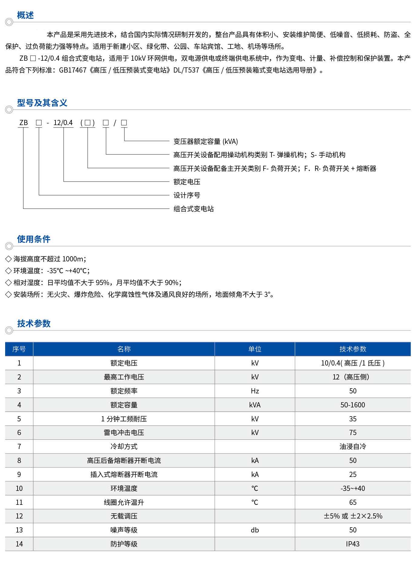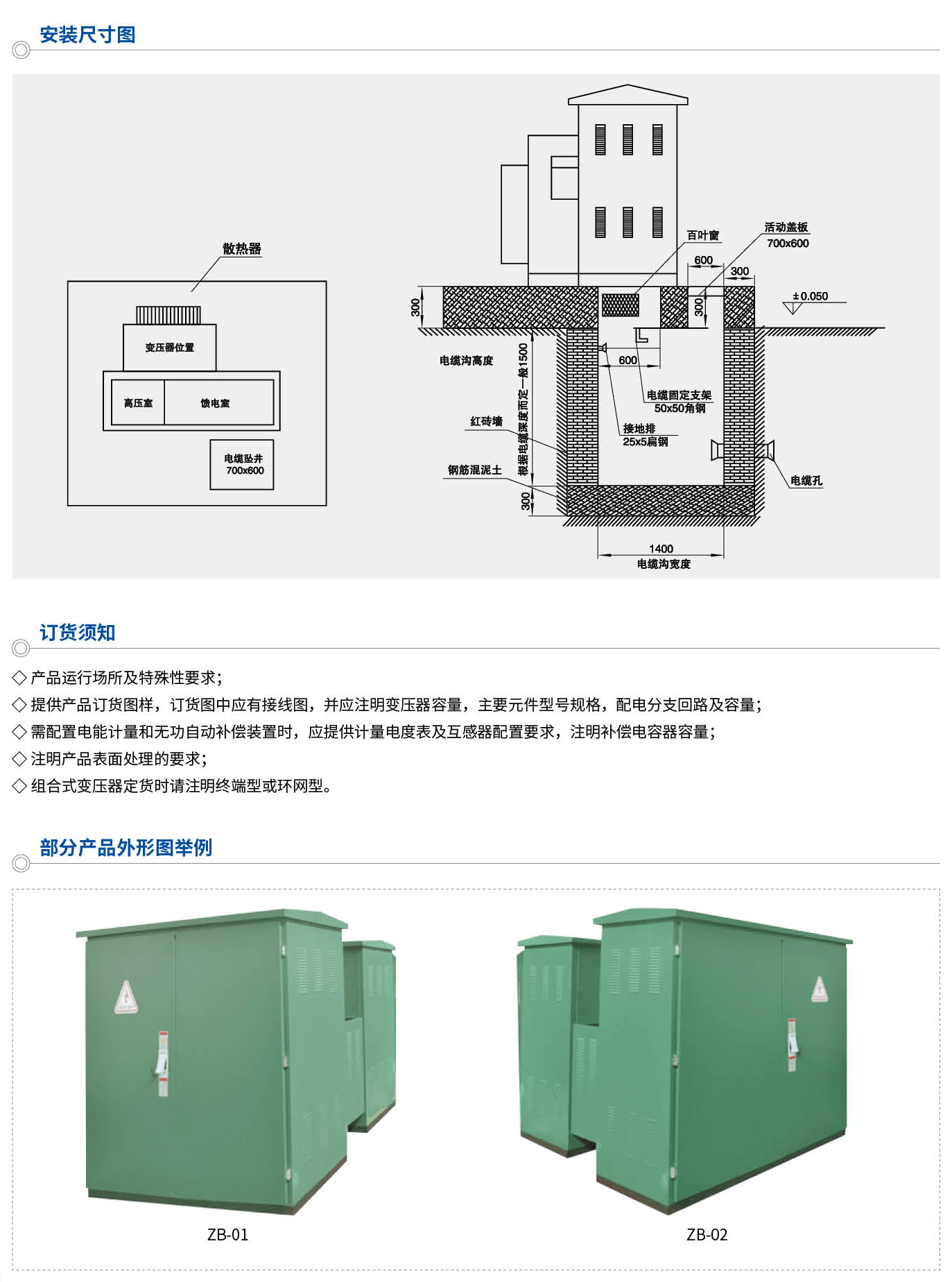 本產(chǎn)品是采用先進(jìn)技術(shù),結(jié)合國(guó)內(nèi)實(shí)際情況研制開(kāi)發(fā)的,整臺(tái)產(chǎn)品具有體積小、安裝維護(hù)簡(jiǎn)便、低噪音、低損耗、防盜、全保護(hù)、過(guò)負(fù)荷能力強(qiáng)等特點(diǎn)。適用于新建小區(qū)、綠化帶、公園、車站賓館、工地、機(jī)場(chǎng)等場(chǎng)所。ZB口-12/0.4組合式變電站,適用于10kW環(huán)網(wǎng)供電,雙電源供電或終端供電系統(tǒng)中,作為變電、計(jì)量、補(bǔ)償控制和保護(hù)裝置。本產(chǎn)品符合下列標(biāo)準(zhǔn):GB17467《高壓/低壓預(yù)裝式變電站》DLT537《高壓/低壓預(yù)裝箱式變電站選用導(dǎo)冊(cè)》。