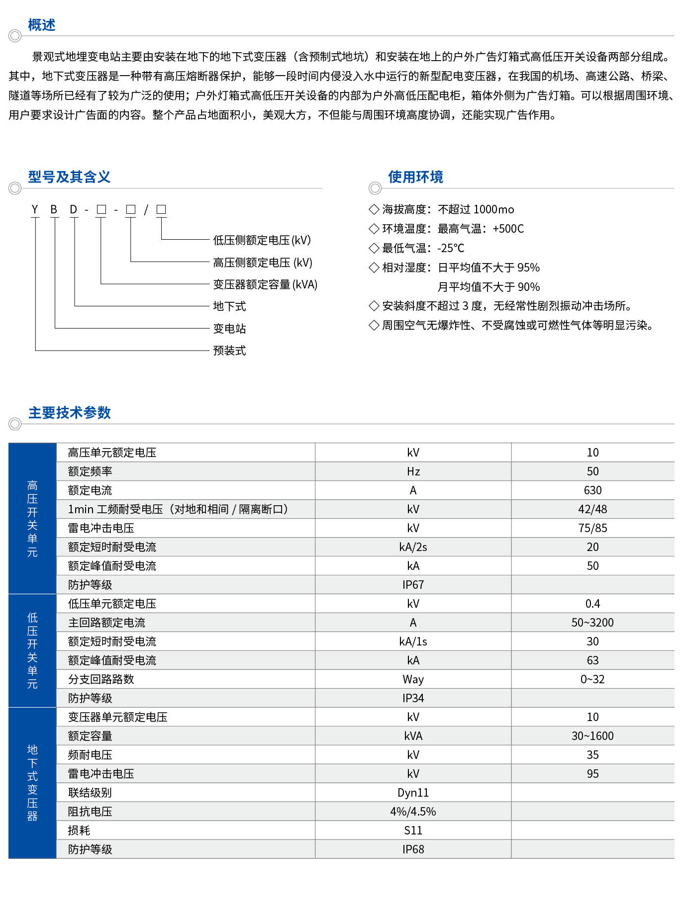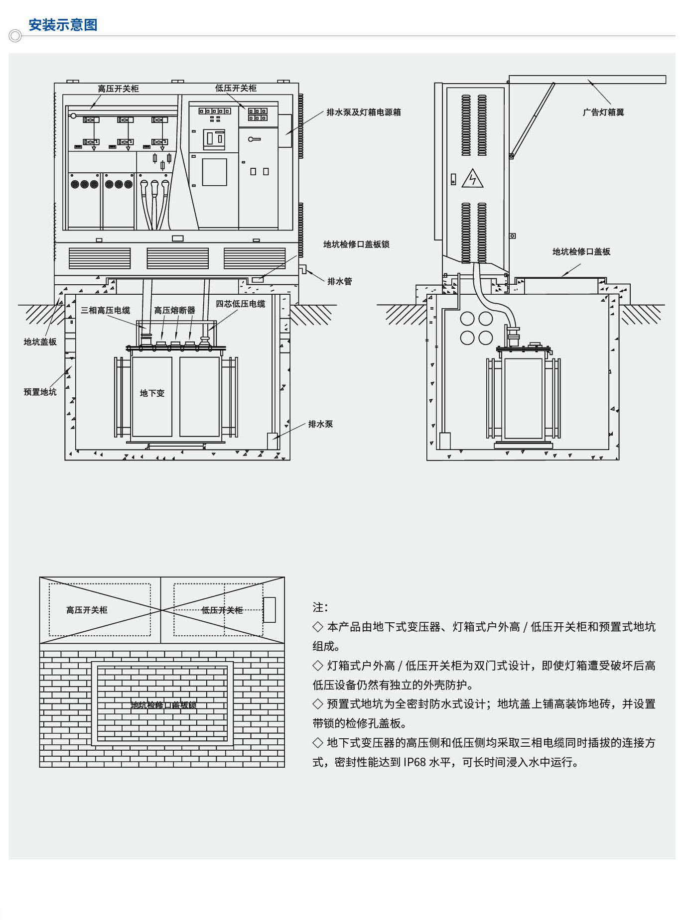 景觀式地埋變電站主要由安裝在地下的地下式變壓器(含預(yù)制式地坑)和安裝在地上的戶外廣告燈箱式高低壓開關(guān)設(shè)備兩部分組成。其中,地下式變壓器是一種帶有高壓熔斷器保護(hù),能夠一段時間內(nèi)侵沒入水中運行的新型配電變壓器,在我國的機場、高速公路、橋梁、隧道等場所已經(jīng)有了較為廣泛的使用;戶外燈箱式高低壓開關(guān)設(shè)備的內(nèi)部為戶外高低壓配電柜,箱體外側(cè)為廣告燈箱??梢愿鶕?jù)周圍環(huán)境、用戶要求設(shè)計廣告面的內(nèi)容。整個產(chǎn)品占地面積小,美觀大方,不但能與周圍環(huán)境高度協(xié)調(diào),還能實現(xiàn)廣告作用。