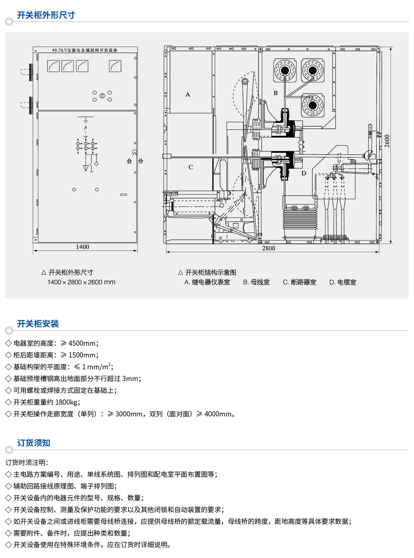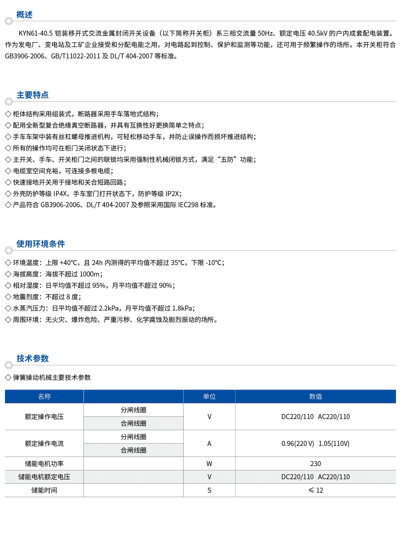 KYN61-40.5鎧裝移開(kāi)式交流金屬封閉開(kāi)關(guān)設(shè)備(以下簡(jiǎn)稱(chēng)開(kāi)關(guān)柜)系三相交流量50Hz、額定電壓40.5kV的戶(hù)內(nèi)成套配電裝置。作為發(fā)電廠、變電站及工礦企業(yè)接受和分配電能之用,對(duì)電路起到控制、保護(hù)和監(jiān)測(cè)等功能,還可用于頻繁操作的場(chǎng)所。本開(kāi)關(guān)柜符合GB3906-2006、GB/T11022-2011及DL/T404-2007等標(biāo)準(zhǔn)。