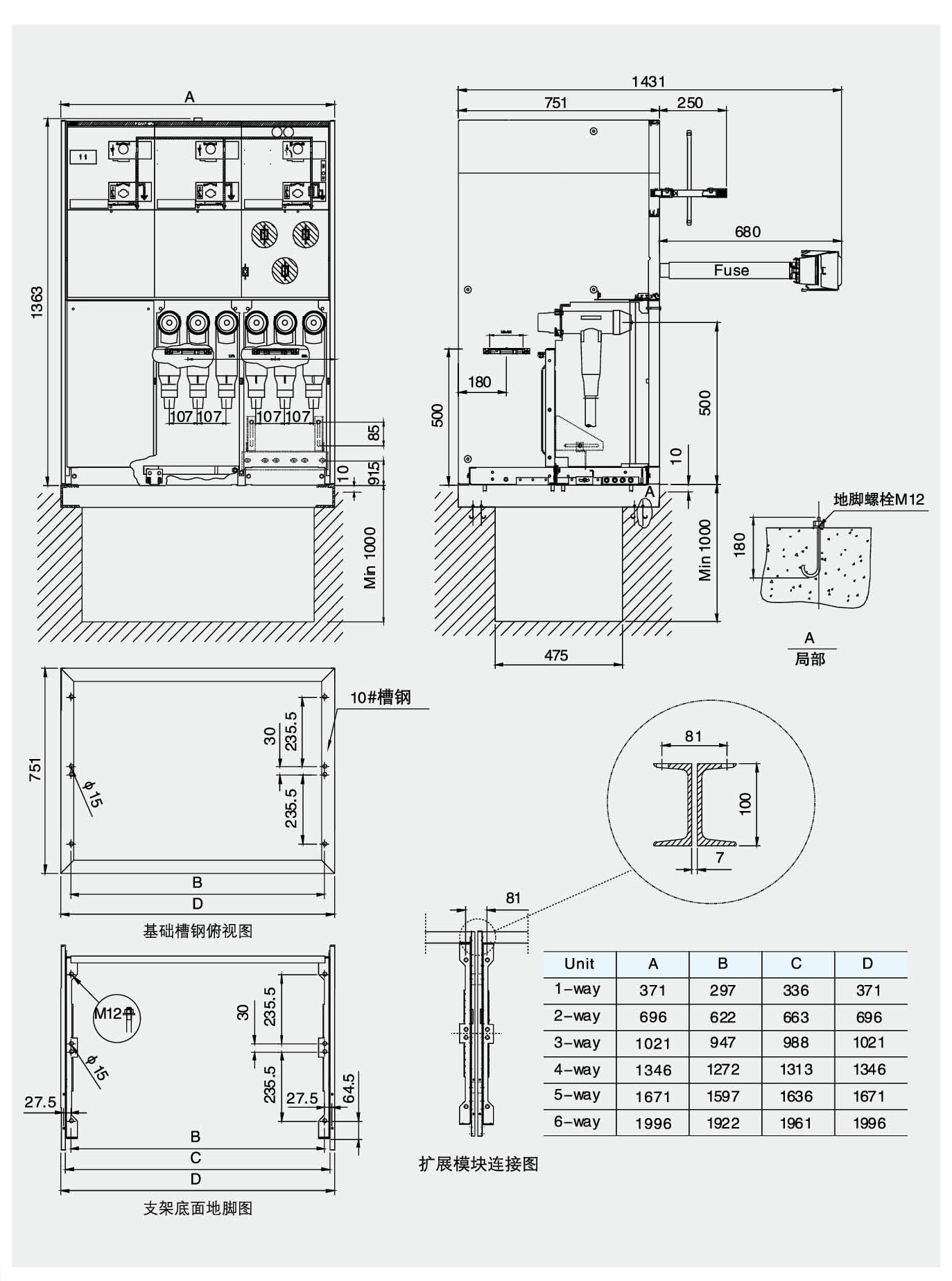 SRM6-12系列充氣式開關(guān)柜安裝在一個鍍鋅板框架上,開關(guān)單元在SF6氣箱內(nèi),氣箱由抗腐蝕和無磁性3mm厚不銹鋼板制成。SF6氣箱是一個“密封壓力系統(tǒng)”在正常工作環(huán)境下可運行20年。SF6氣體正常工作時壓力為0.15~0.4br。氣箱裝有壓力釋放裝置,當壓力過高時,保證氣體能從底部或后部釋放。