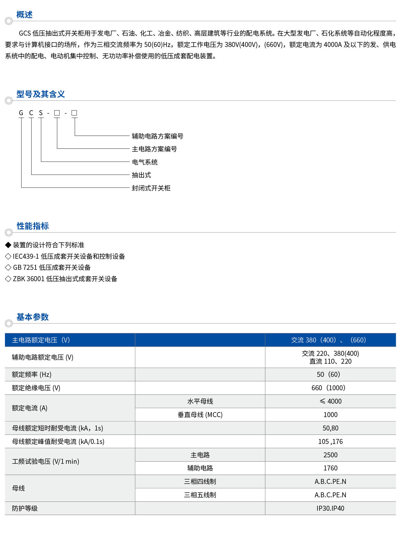 GCS低壓抽出式開關(guān)柜用于發(fā)電廠、石油、化工、冶金、紡織、高層建筑等行業(yè)的配電系統(tǒng)。在大型發(fā)電廠、石化系統(tǒng)等自動(dòng)化程度高,要求與計(jì)算機(jī)接口的場所,作為三相交流頻率為50(60)Hz,額定工作電壓為380V(400V),(660V),額定電流為4000A及以下的發(fā)、供電系統(tǒng)中的配電、電動(dòng)機(jī)集中控制、無功功率補(bǔ)償使用的低壓成套配電裝置。