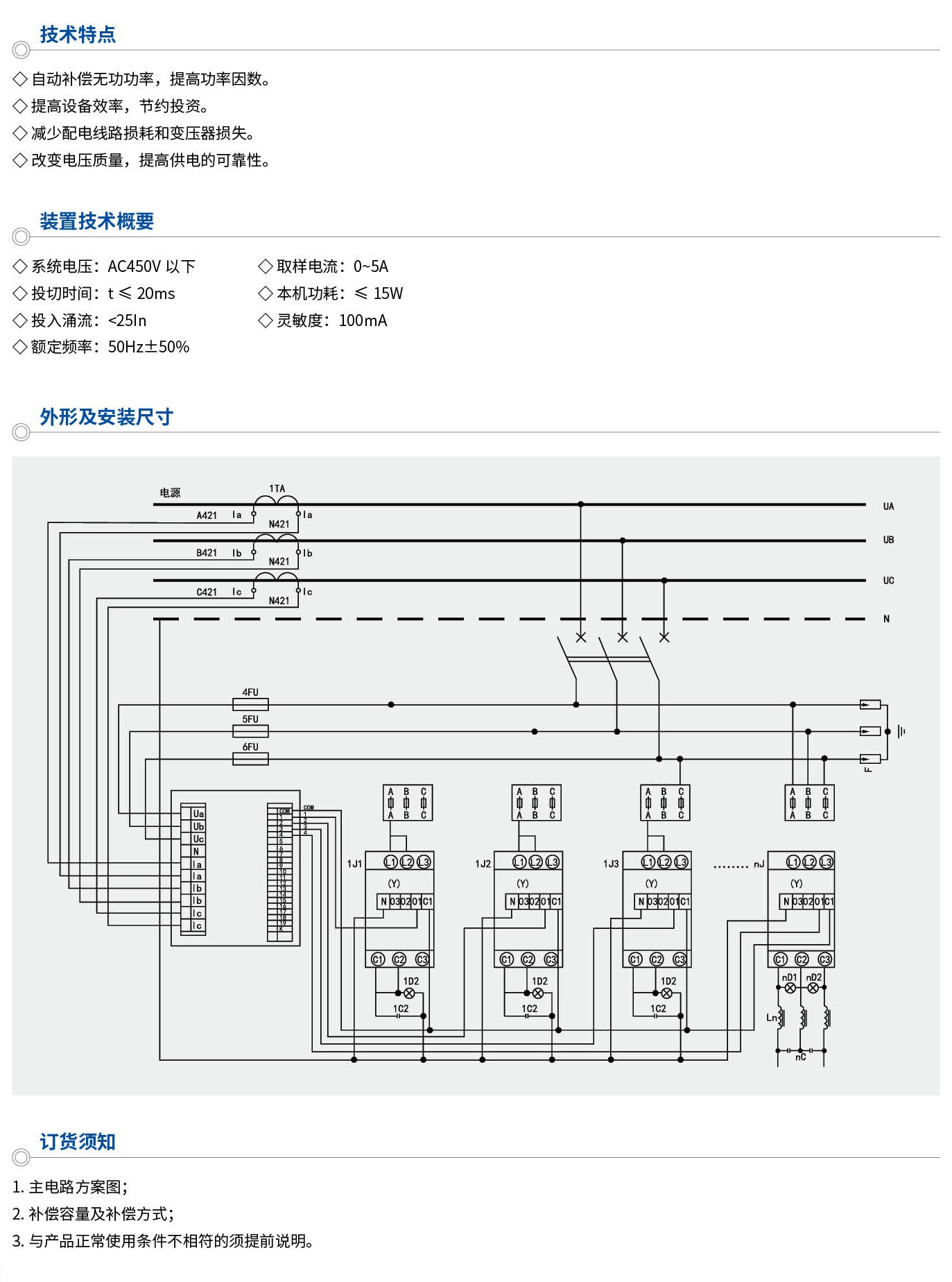 由于本裝置能有效改善用電負荷的功率因數,降低線損,提高變壓器的實際負載能力。具有顯著的節(jié)能效果,同時在系統中采用特定的電抗器,還可以有效防止諧波放大、有效吸收大部分諧波電流,使諧電壓總畸率限值及各次諧波電流含量限值符合國家標準,達到諧波治理的目的。而如果使用普通的接觸器投切電容器組,帶來的將會是大的浪涌電流,慢的補償時間、高的維護費用和短的使用壽命,因此,我們建議用戶在以下場合,能優(yōu)先考慮使用動態(tài)無功補償裝置。如:工礦企業(yè)的變電所、生產車間及民用建筑等的低壓電網中,特別適合負荷經常變化,無功功率不穩(wěn)定的輸配電系統。本產品符合:GB/T15576-2008《低壓成套無功功率補償設備》、IEC60439《低壓成套開關設備和控制設備》等標準。
