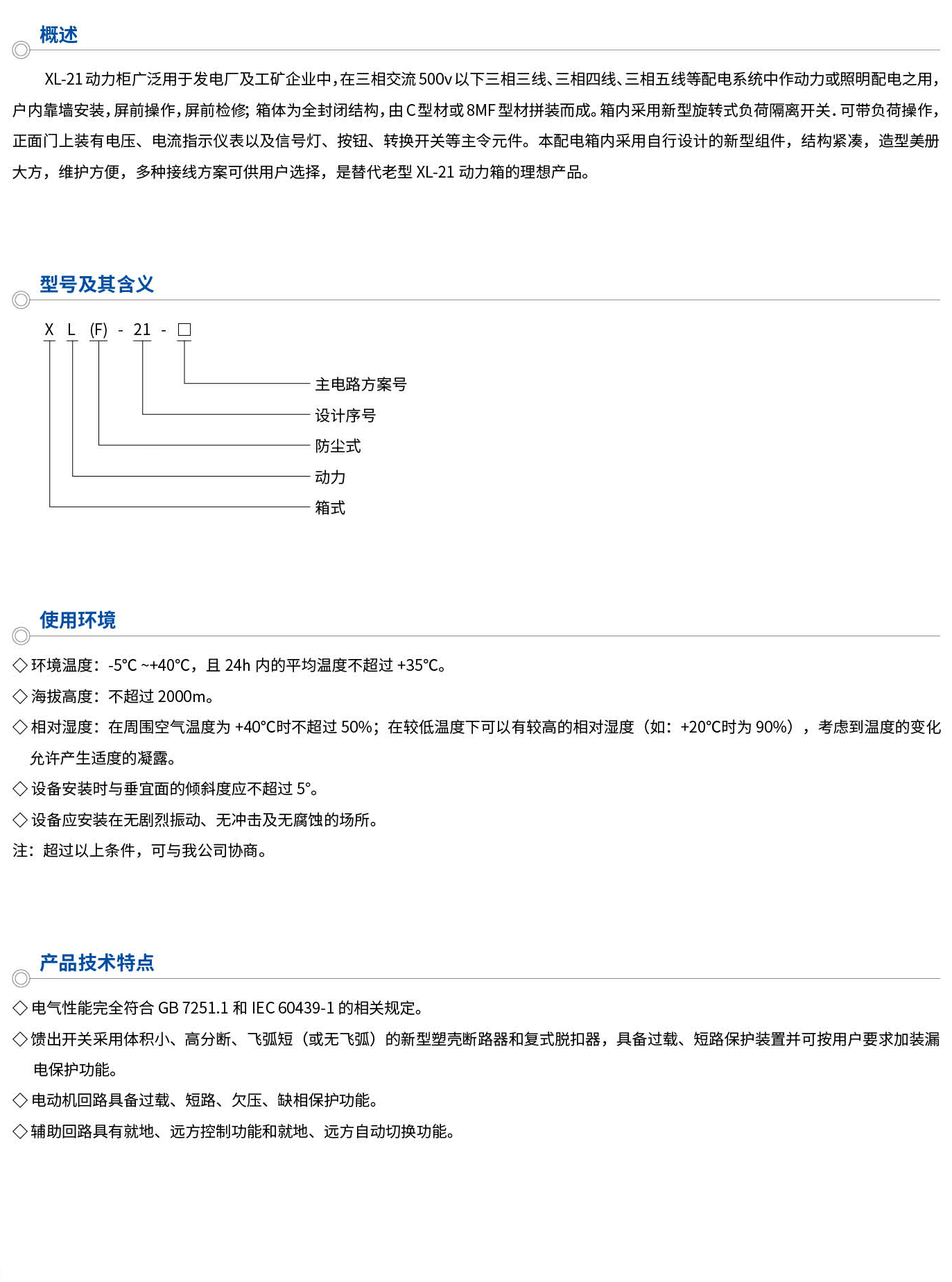 XL-21動(dòng)力柜廣泛用于發(fā)電廠及工礦企業(yè)中,在三相交流500以下三相三線、三相四線、三相五線等配電系統(tǒng)中作動(dòng)力或照明配電之用,戶內(nèi)靠墻安裝,屏前操作,屏前檢修;箱體為全封閉結(jié)構(gòu),由C型材或8MF型材拼裝而成。箱內(nèi)采用新型旋轉(zhuǎn)式負(fù)荷隔離開(kāi)關(guān).可帶負(fù)荷操作,正面門(mén)上裝有電壓、電流指示儀表以及信號(hào)燈、按鈕、轉(zhuǎn)換開(kāi)關(guān)等主令元件。本配電箱內(nèi)采用自行設(shè)計(jì)的新型組件,結(jié)構(gòu)緊湊,造型美冊(cè)大方,維護(hù)方便,多種接線方案可供用戶選擇,是替代老型XL-21動(dòng)力箱的理想產(chǎn)品。